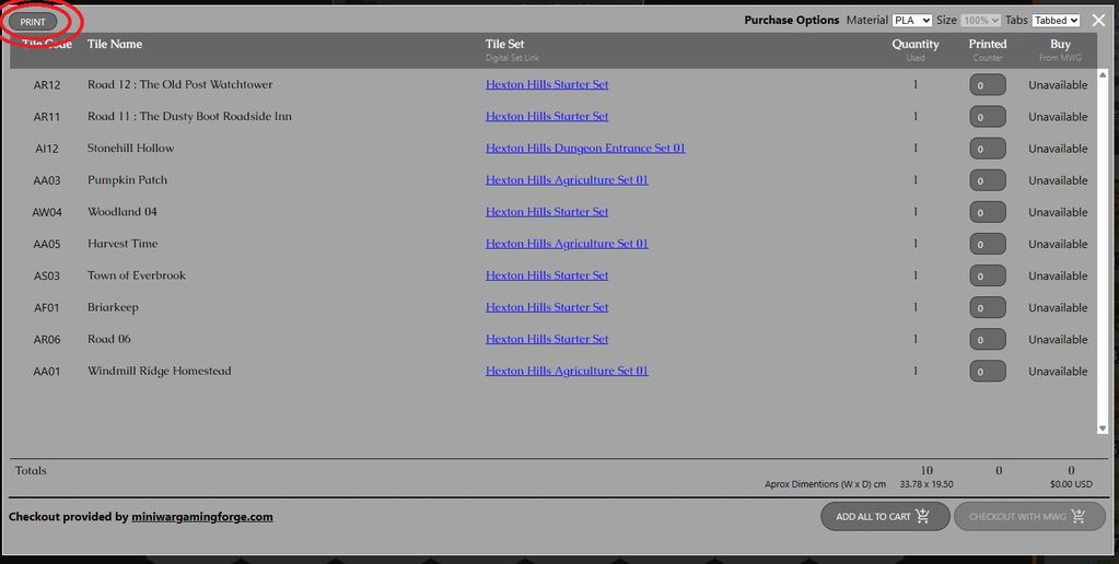 A window like this one will pop up. It'll show the name of each tile and the Quantity that you have in your map. From this window you click the "Print" button located in the top left of the window.