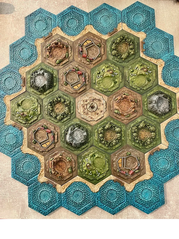 This is an example of what your Catan Board could look like! As you can see there are spaces inside the tiles to place the number tokens for each tile. There are also harbour spaces for all your trades! Lastly there are spacers made to go around each of the tiles so that you have spaces to place your roads and cities.